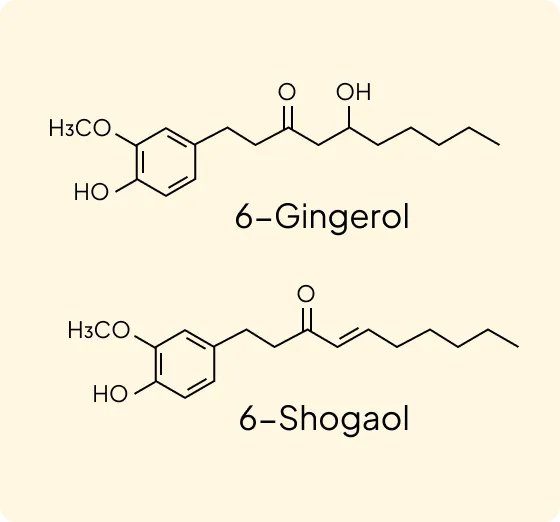 Contains 4 – 7,5% oleoresin with essential oil and sharp substances. The essential oil (1,5 – 3% of the drug) has a variable composition according to its origin. The principal components are sesquiterpenes such as a-zingiberene, ar-curcumene, bisabolene, (E,E)-α-Farnesene, and β-sesquiphellandrene, and monoterpenes like camphor, β-phellandrene, geranial, neral, and linalol. The sharp substances are gingerols and shogaols. They are non-volatile phenilalcanones or phenilalcanonoles with chains of different lengths, the most important ones being the (6)-gingerol and the (6) shogaol. The rhizome of ginger also contains diarylheptanoids: diphenylheptenones, diphenylheptanonoles, diphenylheptanodioles and their acetates. Other components are: starch (approximately 50%), ditherpenes, 6-gingesulphonic acid and monoacyl digalactosyl glycerols.